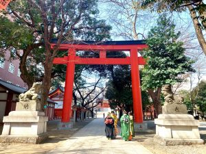 卒業式かな?大きな赤い鳥居には袴姿の学生さんたちがいました