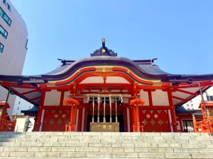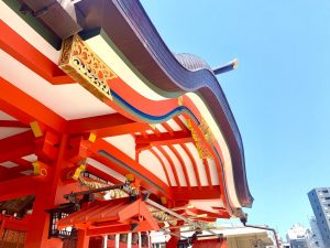 空の青と拝殿の朱色が素晴らしいコントラストでした